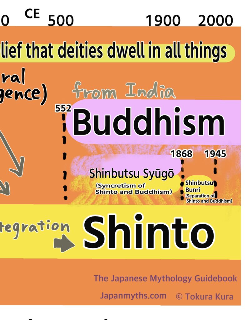 From 552 to 1868, Buddhism and Shinto gradually blended together, with their fusion reaching a peak around 800CE.